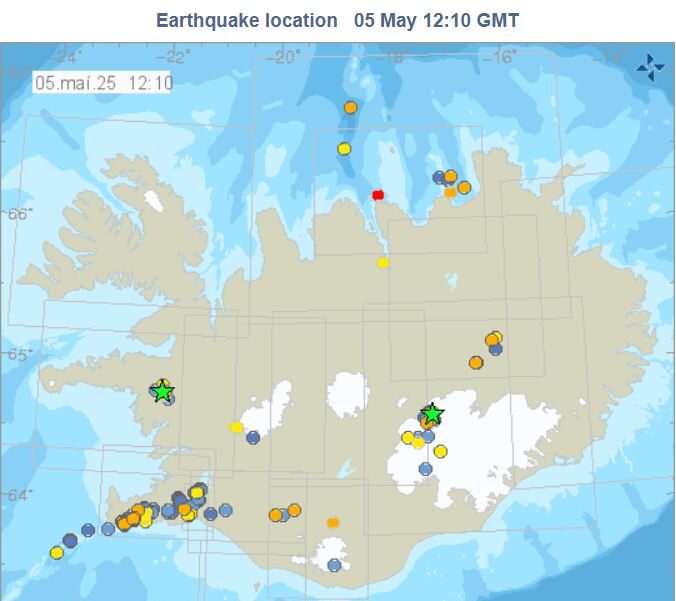 Z tych bardziej znaczących to wczoraj po południu wystąpił wstrząs o magnitudzie 3,1 na północ od Borgarnes. W tym regionie hipocentra wstrząsów znajdują się zazwyczaj na głębokości około 17 km.