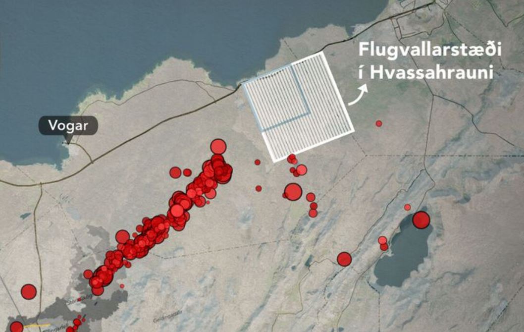 Na podstawie obrazu sporządzonego z uwzględnieniem aktywności sejsmicznej widać, że tunel magmowy, który utworzył się na początku kwietnia, sięgał daleko w kierunku proponowanego lotniska w Hvassahraun.