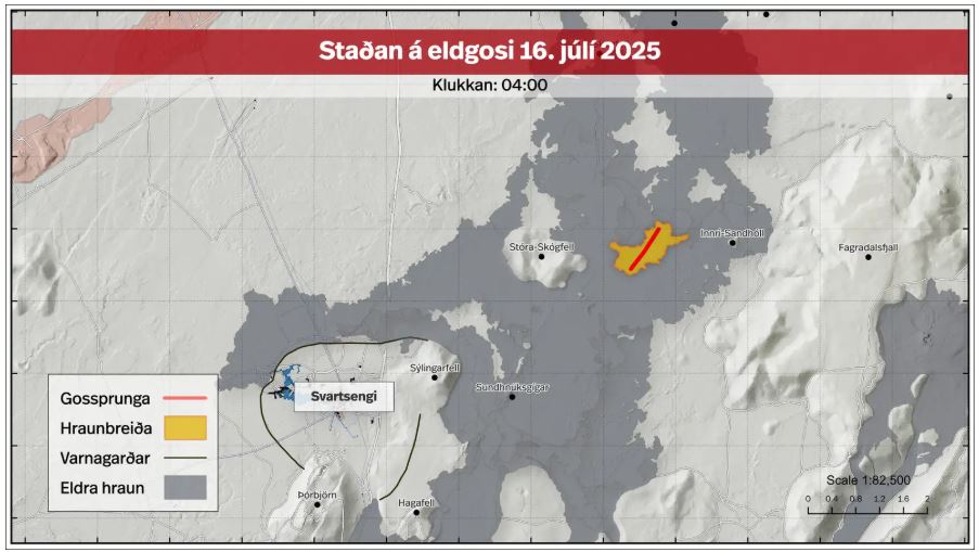 Szczelina erupcyjna ma od 700 do 1000 metrów długościi nie wydaje się wydłużać. Wypływ lawy wydaje się być najbardziej skoncentrowany na południowym wschodzie. Służby monitorują, czy lawa może zacząć płynąć w kierunku Grindavíkurvegur na północ od Stóra-Skógfell.