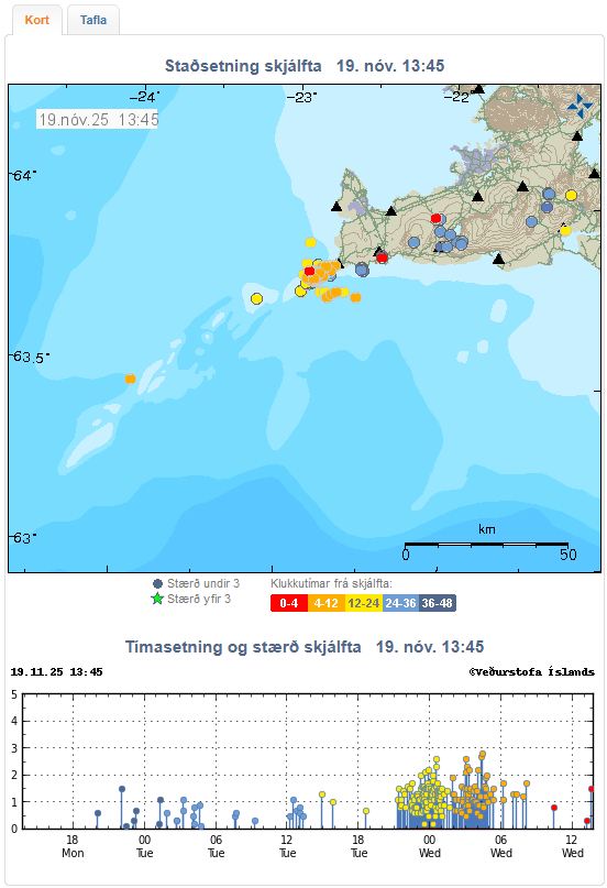 Rój wstrząsów został zarejestrowany w nocy i był odczuwalny na półwyspie Reykjanes od około godziny 21:00 wczorajszego wieczoru. Magnituda tych wstrząsów nie przekroczyła wartości 3.