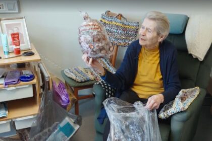 Mimo że coraz słabiej widzi, dzierga torby z plastiku