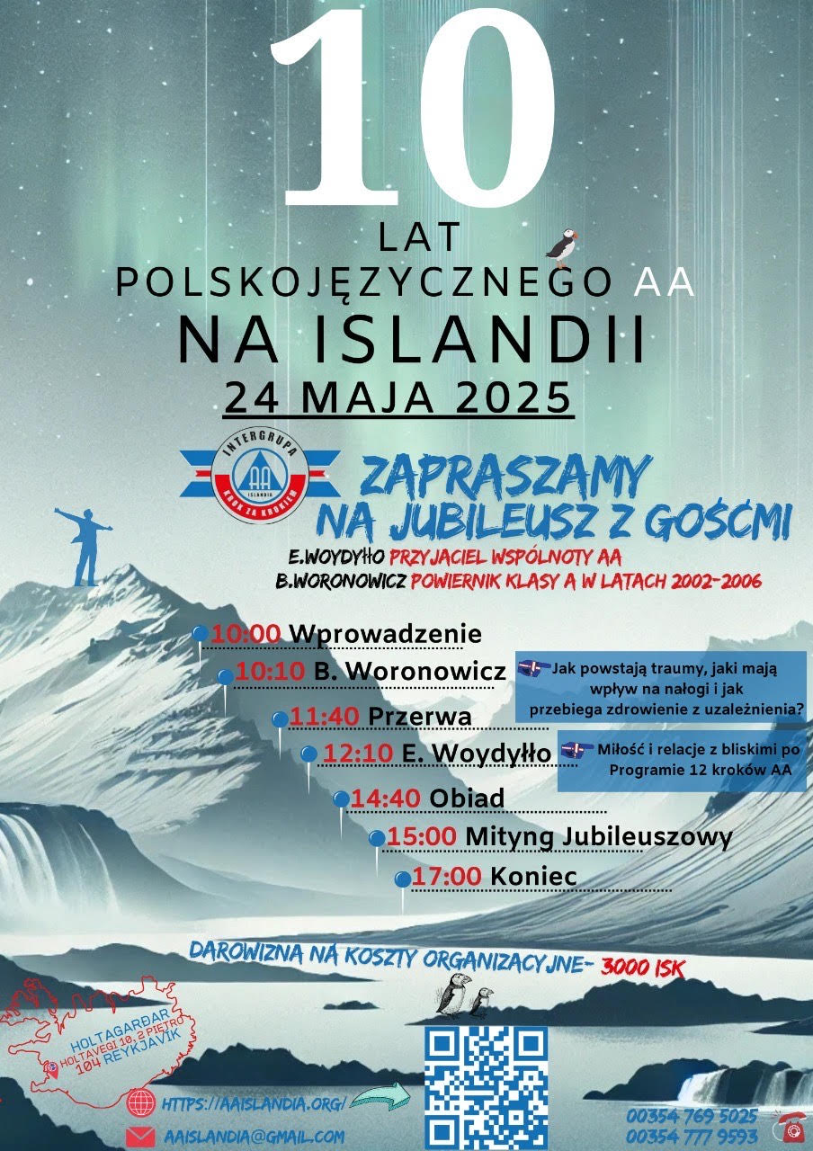 Na dziś wspólnota AA na Islandii działa stacjonarnie w Reykjaviku, Kópavogur, Selfoss, Keflaviku, Akranes i Akureyri oraz na meetingach online. Jeśli masz problem z piciem lub ktoś z Twoich bliskich potrzebuje pomocy zgłoś się do wspólnoty i daj sobie szansę. Więcej informacji na aaislandia.org lub pod nr. tel. 7779593.